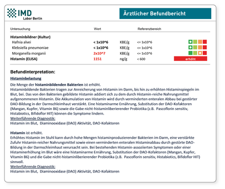 Histamin ist ein biogenes Amin, das durch Decarboxylierung der Aminosäure Histidin entsteht. Histamin spielt eine wichtige Rolle im Immunsystem. Es ist weniger bei der direkten Elimination von Erregern, sondern v.a. bei der Regulation von Immunabwehrmechanismen im Gewebe wie Gefäßdilatation und Gewebedurchblutung oder der Schmerzvermittlung von Bedeutung. Symptome einer Histaminbelastung treten auf, wenn "Histaminüberschüsse" systemisch wirksam werden, d.h. bei verstärkter Belastung oder bei vermindertem Abbau.
