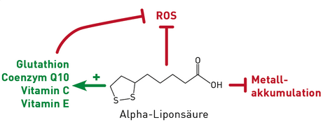 Abb. 1 Alpha-Liponsäure wirkt als Antioxidans und Radikalfänger, fördert das „Recycling“ anderer Antioxidantien, indem sie als Reduktionsmittel wirkt, und unterstützt die Ausscheidung von Metallen auch aus dem intrazellulären Raum.