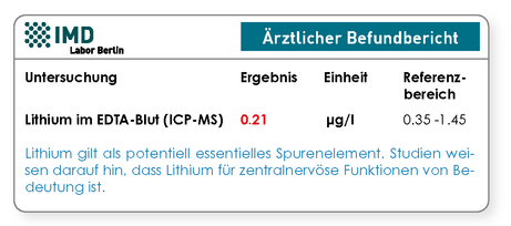 Die zugrunde liegenden biochemischen Mechanismen der beobachteten Assoziationen sind bisher nicht verstanden. Dennoch erscheint es im Einzelfall – kurativ oder präventiv – relevant, den Lithiumstatus des Patienten zu bestimmen. Dies ist nun mittels einer hoch sensitiven ICP-MS-basierten Analyse im EDTA-Vollblut möglich. Die für die Medikamentenspiegel-Analyse herkömmlich verwendete photometrische Lithiummessung im Serum ist aufgrund ihrer geringen Sensitivität nicht geeignet, den physiologischen Lithium Blutspiegel zu bestimmen.