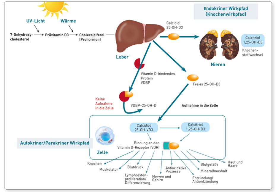 Vitamin D ist kein Vitamin im eigentlichen Sinne, sondern ein Hormon. Wie bei anderen Hormonen, z.B. Testosteron oder Schilddrüsenhormonen, ist nur freies, nicht gebundenes Vitamin D biologisch aktiv.