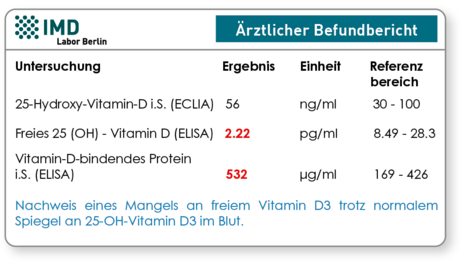 - Abklärung von Patienten bei denen Vitamin D-Substitution nicht zu einem Anstieg des 25-OH-Vitamin D3 führt. Es gilt als „Entwarnung“, wenn das freie Vitamin D unter Therapie in den Normbereich geht.