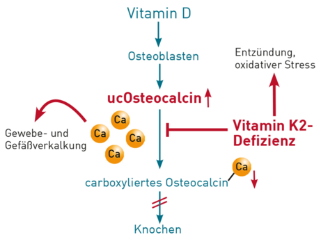 Abb. 1 Vitamin K-Einfluss auf Vitamin D-Effekte im Knochenstoffwechsel. Ein Mangel insbesondere an K2 führt zu einem Anstieg an ucOsteocalcin und hemmt den Einbau von Calcium in den Knochen. Überschüssiges Calcium fördert die Verkalkung von Gefäßen und Gewebe. Ein Vitamin K-Mangel begünstigt zudem entzündliche Prozesse und oxidativen Stress.