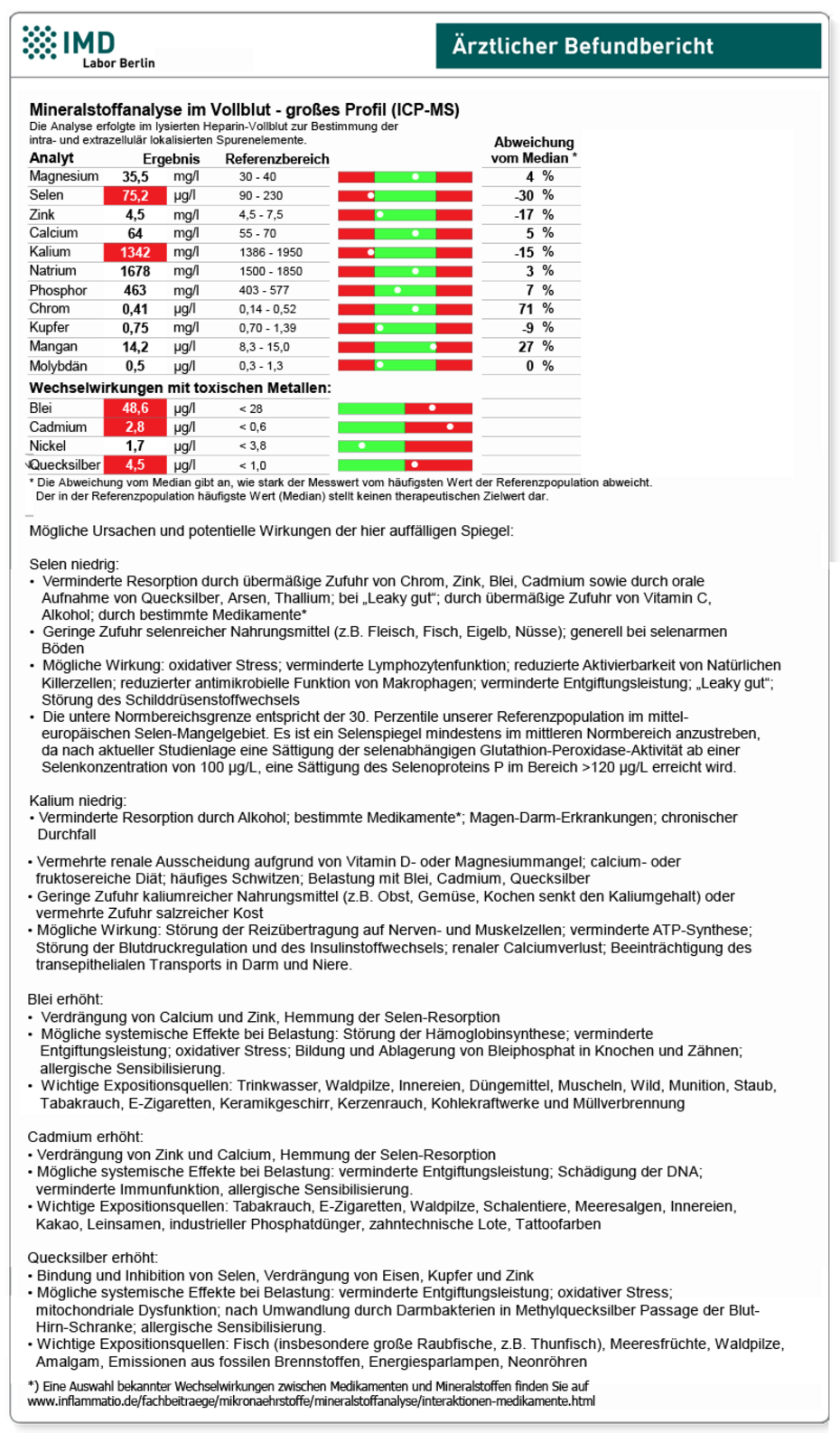 | kleines Mineralstoffprofil "7+2" | EDTA- oder Li-Heparinblut | 50,13 € | Magnesium, Selen, Zink, Chrom, Kupfer, Mangan, Molybdän, Cadmium, Nickel |
