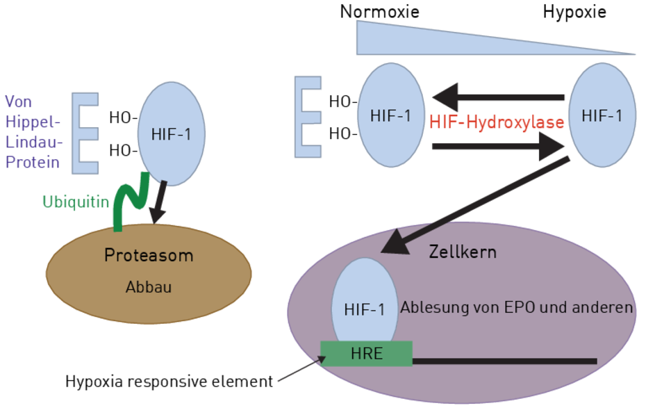 Der Hypoxie-induzierbare Faktors 1 (HIF-1) wird im Zytoplasma der Zellen des Körpers gebildet, dann freigesetzt und gelangt in Zellen u. a. von Leber und Niere. Dort diffundiert HIF-1 in den Zellkern und stimuliert dort die Ablesung der DNA-Information für eine Reihe von regulatorischen Proteinen wie z.B. von Erythropoetin, Angiogenese stimulierenden Faktor, VEGF, iNOS und anderen Faktoren, die unter anderem auf den Eisenstoffwechsel und die Zellatmung Einfluss nehmen. Ist das Gewebe ausreichend mit Sauerstoff versorgt, wird HIF-1 durch die HIF-1-Hydroxylase oxydiert, an Hippel-Lindau-Protein gebunden, ubiquitiniert und im Proteasom der Zelle abgebaut. So resultieren bei Normoxie verminderte HIF-1 Konzentration mit verminderter Erythropoetinbildung und bei Hypoxie das Gegenteil. Erythropoetin stimuliert die Erythropoese und die Freisetzung neu gebildeter Erythrozyten aus dem Knochenmark ins periphere Blut und wirkt so der Anämie entgegen.