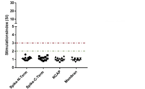 Nicht-Geimpfte und Nicht-Infizierte zeigen keine T-Zellreaktivität im LTT auf SARS-CoV-2-Peptide. Grüne Markierung zeigt den Bereich, ab dem ein grenzwertiges Ergebnis vorliegt (SI zwischen 2 und 3), die rote Markierung zeigt den deutlich positiven Bereich auf (SI >3).