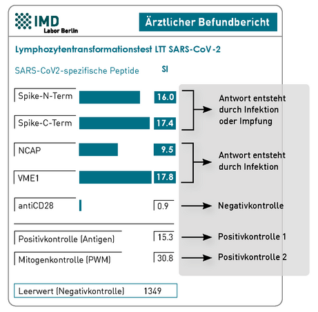 Der LTT SARS-CoV-2 Differenzierung“ erfasst die T-Zell-Reaktion auf Spike-, Nucleocapsid- und Membranprotein. Da die bisher in der EU zugelassenen Impfstoffe (Vektor- oder mRNA-Impfstoffe) ausschließlich auf dem Spike-Protein basieren und ein Kontakt zu Nucleocapsid- und Membranprotein ausschließlich durch eine (echte) Infektion zu Stande gekommen sein können, ermöglicht der „LTT SARS-CoV-2 Differenzierung“ eine Unterscheidung, ob die Immunität durch die Impfung oder durch eine vorangegangene oder zusätzliche Infektion entstanden ist.