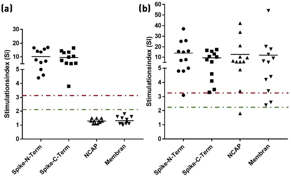 Geimpfte (a) zeigen lediglich eine T-Zellreaktivität auf das Spike-Protein, während Probanden mit durchgemachter Infektion (b) auch auf weitere Virusbestandteile reagieren. Grüne Markierung zeigt den Bereich, ab dem ein grenzwertiges Ergebnis vorliegt (SI zwischen 2 und 3), die rote Markierung zeigt den deutlich positiven Bereich auf (SI >3).