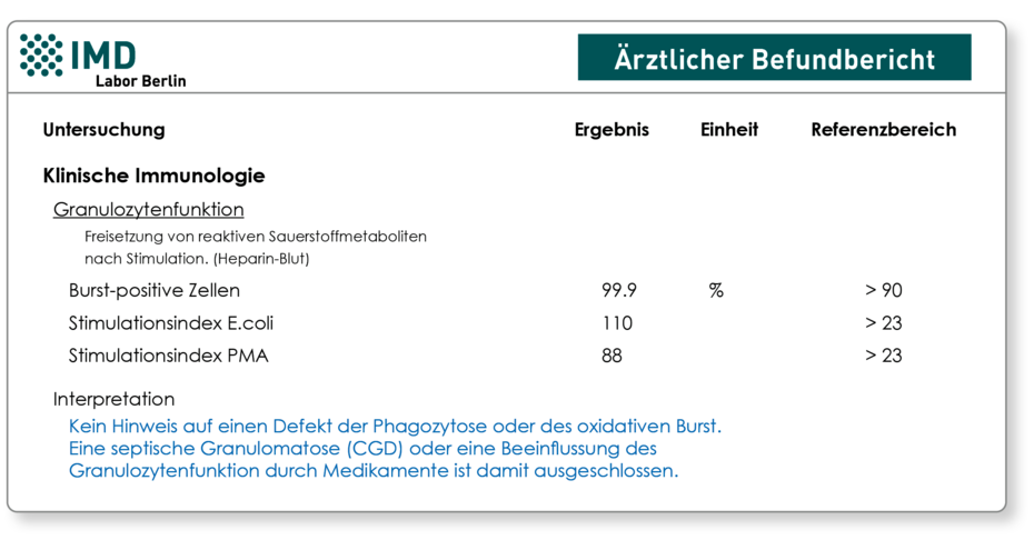 Es lassen sich durch den Test also Störungen der Phagozytose (reduzierter oxidativer Burst bei Stimulation mit Bakterien und normalem oxidativem Burst bei Stimulation mit PMA) und Störungen des oxidativen Burst (Reduktion bei beiden Stimulationen) voneinander abgrenzen.
