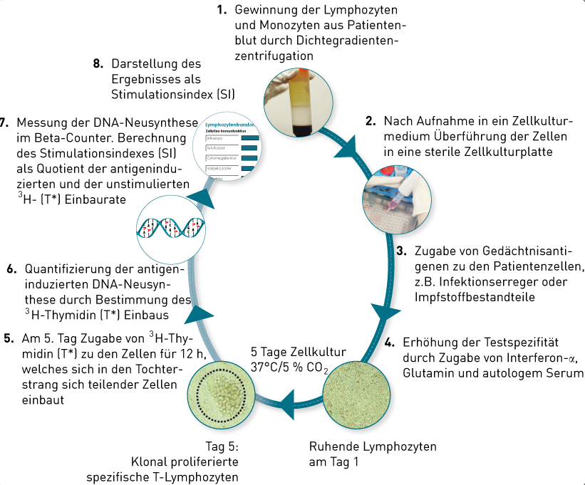 Mit dem LTT-Immunfunktion (LTT-FU) wurde eine Methode entwickelt, die es erlaubt, quantitative Messungen der Funktionsfähigkeit von Immunzellen aus dem Blut vorzunehmen (von Baehr 2001). Der Test beruht auf dem Prinzip der Lymphozytenstimulation durch Bestandteile verbreiteter Infektionserreger oder Impfstoffe (Gedächtnisantigene = Recallantigene), gegen die bei „Immun-Gesunden“ eine starke Immunreaktivität bestehen sollte. Im LTT werden diese Antigene durch Monozyten und dendritische Zellen aufbereitet und den T- Helferlymphozyten präsentiert. Die jeweils spezifischen T- Helfer- Gedächtniszellen werden, abhängig von der aktuellen Immunlkompetenz, aktiviert und zur Zellteilung stimuliert. Die dabei obligate DNS-Synthese wird quantitativ bestimmt. Eine starke Aktivierung im LTT ist nur dann zu erwarten, wenn die Immunfunktion intakt ist bzw. eine Verbesserung der Immunfunktion durch immunstimulierende Therapien erreicht wurde (Therapiekontrolle).