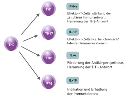 Interleukin-17 (IL-17) wird von den erst kürzlich beschriebenen TH17-Helfer-Zellen produziert, was das bisher akzeptierte, sehr strikte TH1/TH2-Modell endgültig in Frage gestellt hat. TH17-Zellen vermitteln zwar ähnlich den IFN-γ-produzierenden TH1-Zellen proentzündliche Effekte, ihre Bedeutung liegt aber eher bei den chronisch-entzündlichen Immunprozessen. So werden effiziente TH1 (IFN-γ)-Immunantworten durch IL-17 unterdrückt, was zur Persistenz des Erregers oder Antigens und somit zur Chronifizierung der Immunreaktion (Chronische Infektion, Autoimmunerkrankungen) führt.