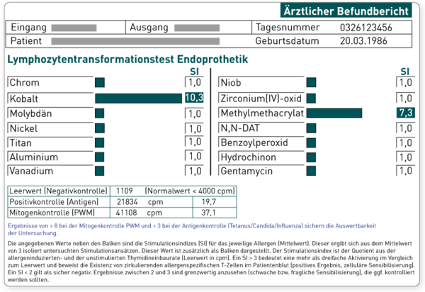 Befund: Im LTT Nachweis einer zellulären Sensibilisierung im Sinne einer Typ IV-Immunreaktion gegenüber Kobalt und auch Methylmethacrylat (MMA). Gegenüber den anderen potentiell in Implantatmaterialien enthaltenen Metallen oder den in Zementen enthaltenen Substanzen wie Benzoylperoxid und Gentamycin liegt kein Hinweis auf eine zellulär bedingte Unverträglichkeit vom Typ IV vor. Ein Kobalt-enthaltenes Material sollte allenfalls verwendet werden, wenn die metallischen Endoprothesenkomponenten beschichtet werden. Sollte ein Acrylat-haltiger Zement verwendet werden, empfehlen wir die präventive Testung des Nativmaterials.