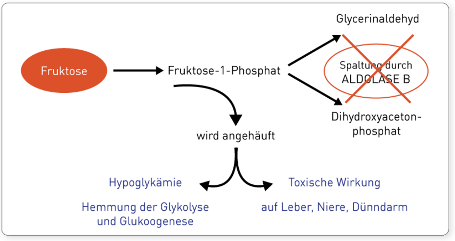 Mit der Nahrung aufgenommene Fruktose wird in der Leber verstoffwechselt. Dabei wird sie zunächst zu Fruktose-1-Phosphat umgebaut. Für den nächsten Umbauschritt ist das Enzym Aldolase B zuständig. Dieses Enzym ist in den Zellen der Leber, Niere und der Dünndarmschleimhaut lokalisiert und spaltet das Fruktose-1-Phosphat in Glycerinaldehyd und Dihydroxyacetonphosphat. Ist das Aldolase B-Enzym genetisch bedingt stark beeinträchtigt, kommt es zu einer Anhäufung des Fruktose-1-Phosphat in den Zellen mit gravierender toxischer Wirkung. Außerdem hemmt der erhöhte Fruktose-1-Phosphat-Spiegel die Glykolyse.
