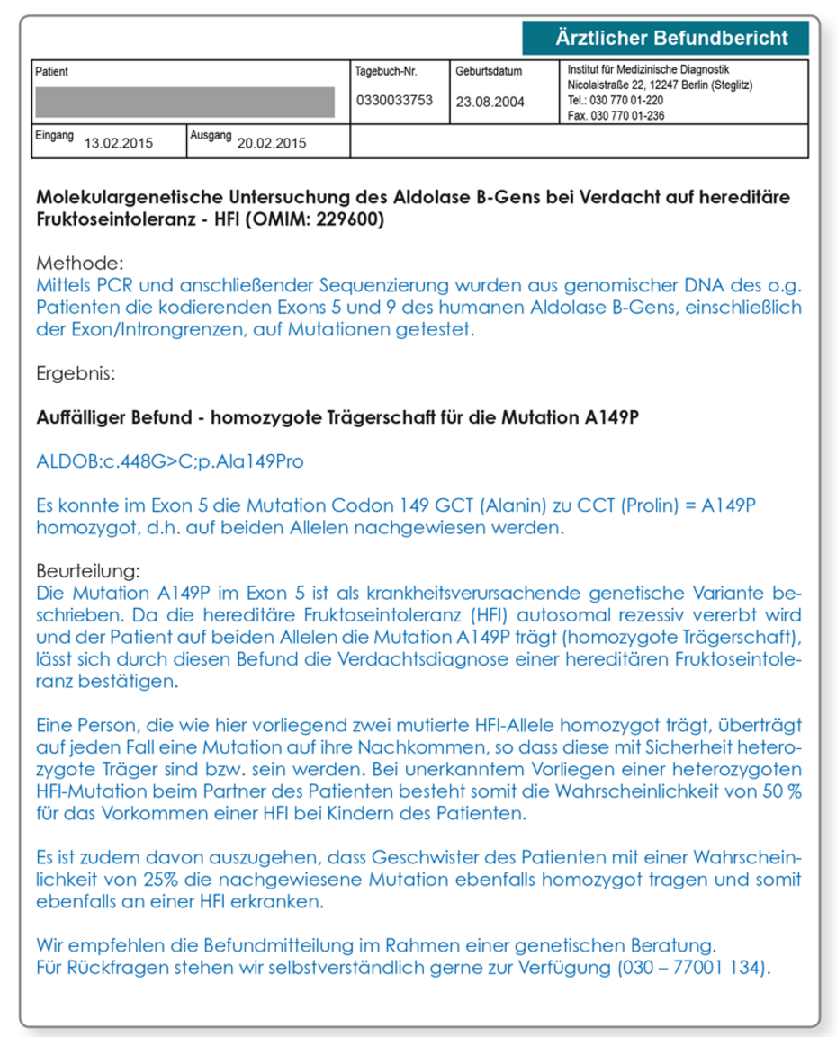 Abb. Der Patient trägt auf beiden Allelen (mütterliches und väterliches) die Mutation A149P. Dieser Befund bestätigt eine hereditäre Fruktoseintoleranz.