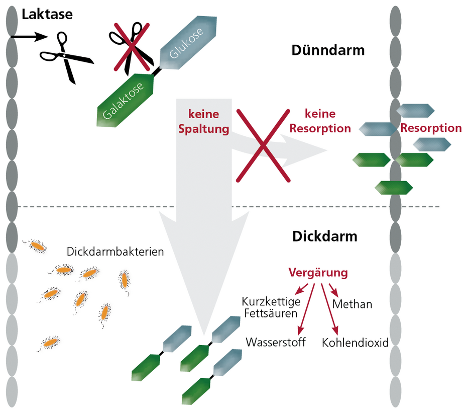 Mangelt es an dem Enzym Laktase, kann Laktose nicht gespalten und daher nicht resorbiert werden. Die Laktose gelangt dann unverdaut bis in den Dickdarm, wo sie von den dort regulär vorhandenen Darmbakterien vergoren wird. Die Laktoseintoleranz ist somit durch einen Enzymmangel bedingt und darf nicht mit einer Milchallergie verwechselt werden, bei der das Immunsystem auf Milchbestandteile reagiert.