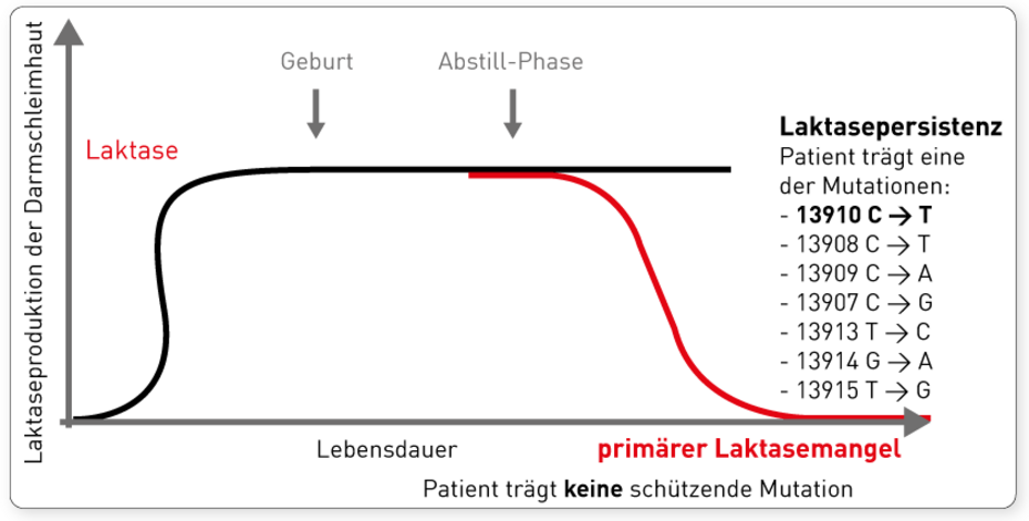 Normalerweise vermindert sich, wie bei allen Säugetieren, auch beim Menschen die Produktion der Laktase kontinuierlich nach dem Abstillen. Als Anpassung an den lebenslangen Verzehr von Milchzucker sind jedoch die schützenden Mutationen -13910 C → T, -13908 C → T, -13909 C → A, -13907 C → G, -13913 C → T, -13914 G → A und-13915 T → G entstanden, die jede für sich, eine lebenslange Laktasepersistenz bewirken. Im Labor kann untersucht werden, ob der Patient eine dieser genetischen Varianten trägt.