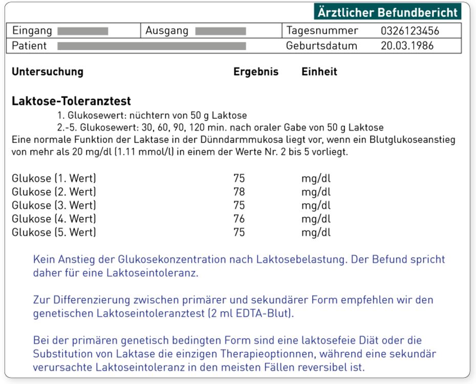 Abb. Ein fehlender Anstieg des Blutzuckers nach Laktosegabe und die Entwicklung von Symptomen zeigen eine Laktoseintoleranz an. Falsch negative Resultate können bei Patienten mit Diabetes mellitus oder bakterieller Fehlbesiedlung auftreten. Störungen der Magenentleerung beeinflussen das Ergebnis: schnelle Magenpassage führt zu höheren Blutzuckerwerten, langsame Passage zu niedrigeren Werten.