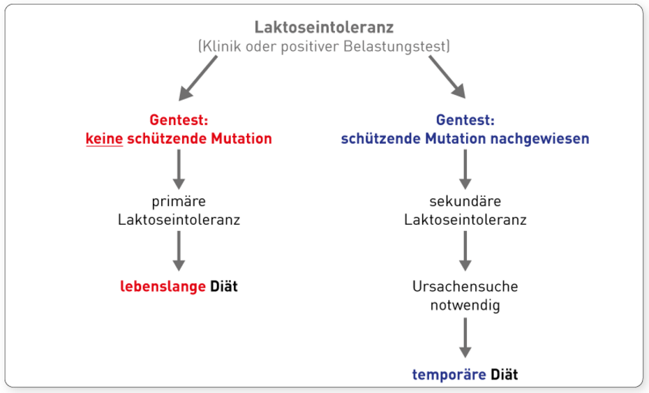 Mit Hilfe des Gentests kann zwischen der primären und der sekundären Laktoseintoleranz unterschieden werden. Der Laktoseintoleranz-Gentest empfiehlt sich daher als Nachfolgeuntersuchung bei allen positiven Ergebnissen im Laktosebelastungstest.