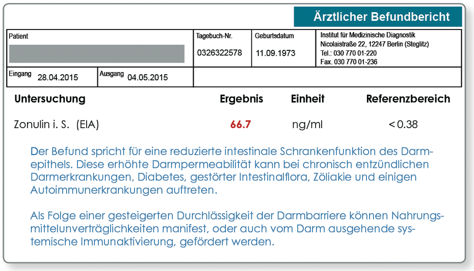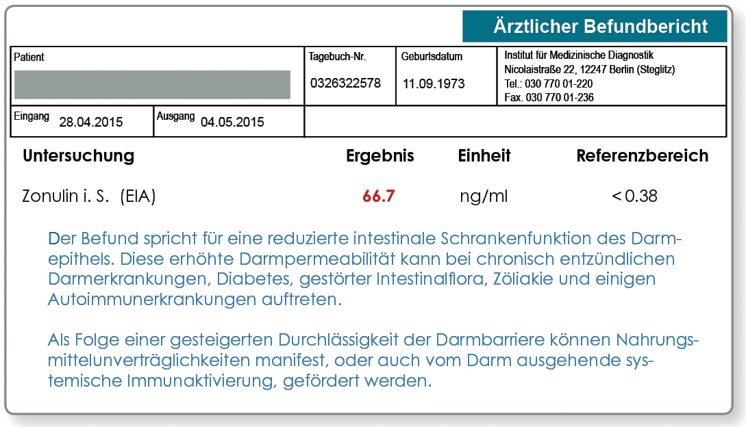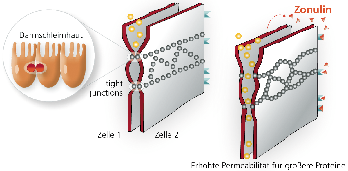 Die Epithelzellen der Darmschleimhaut werden durch schmale Bänder (sogenannte tight junctions) zusammengehalten. Die tight junctions verschließen somit die Zellzwischenräume und sichern eine intestinale Barriere. Die tight junctions werden durch das Protein Zonulin reguliert. Zonulin wird nach unterschiedlichen Reizen von der Darmschleimhaut abgegeben und bewirkt eine Öffnung der interepithelialen Kanäle. Studien zeigen, dass erhöhte Zonulinspiegel mit einer gesteigerten Darmpermeabilität korrelieren. Mit der Analyse des Zonulinspiegels im Serum, kann die Darmpermeabilität bei gut belegter vergleichbarer Aussage ohne den Aufwand einer Provokation (z.B. Laktose/Mannitol-Quotient) analysiert werden.