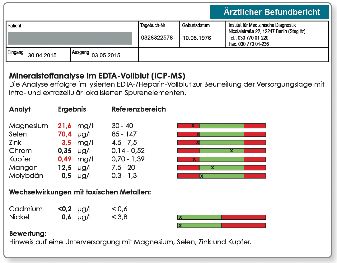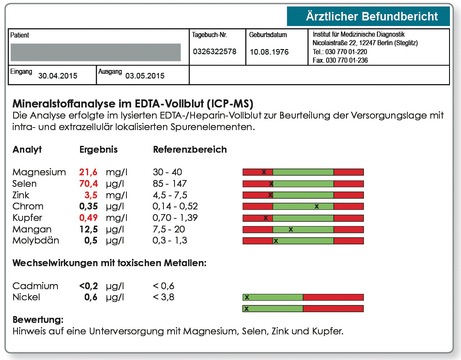 | "klein" | EDTA- oder Li-Heparinblut | Magnesium, Selen, Zink, Chrom, Kupfer, Mangan, Molybdän, Cadmium, Nickel |