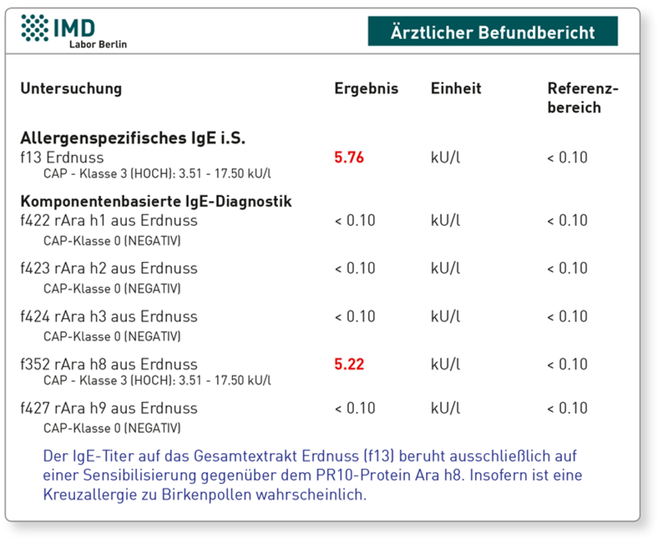 Abb. Bei der Patientin zeigte die Komponenten-basierte Diagnostik, dass das primär beunruhigend positive Ergebnis auf das Erdnuss-Gesamtextrakt (f13) nur eine Kreuzallergie zu Birkenpollen ist (PR10-Protein Ara h8). Eine Sensibilisierung auf die für systemische (anaphylaktische) Reaktionen verantwortlichen Speicherproteine (Ara h1, Ara h2 und Ara h3) und das Lipid-Transferprotein Ara h9 liegt nicht vor.