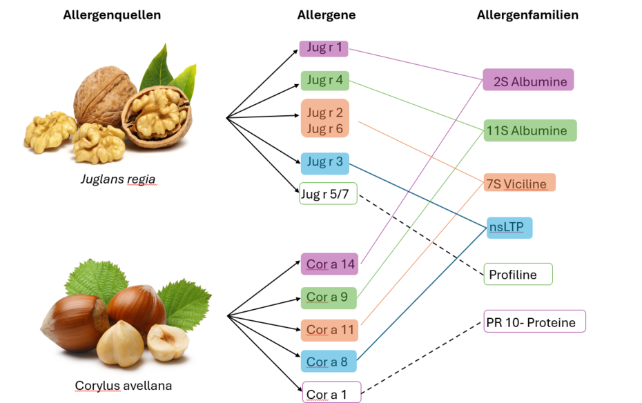 Allergien auf Haselnüsse und Walnüsse sind vielfältiger, als es klassische Diagnostik vermuten lässt. Neben den bekannten Hochrisiko-Speicherproteinen 2S-Albumin und 11S-Globulin sind die 7S-Globuline – die sogenannten Viciline – in den Fokus gerückt. Sie gelten als klinisch relevante Hauptallergene und sind eng mit primären, potenziell systemischen Reaktionen verbunden. Die Bestimmung von spezifischem IgE gegen Vicilin-Komponenten (z.B. Jug r 2, Jug r 6, Cor a 11, Cor a 16) liefert daher entscheidende Hinweise auf eine echte, klinisch bedeutsame Nussallergie - besonders dann, wenn 2S-Albumin und 11S-Globulin negativ sind, können Viciline die diagnostische Lücke schließen und Klarheit schaffen.